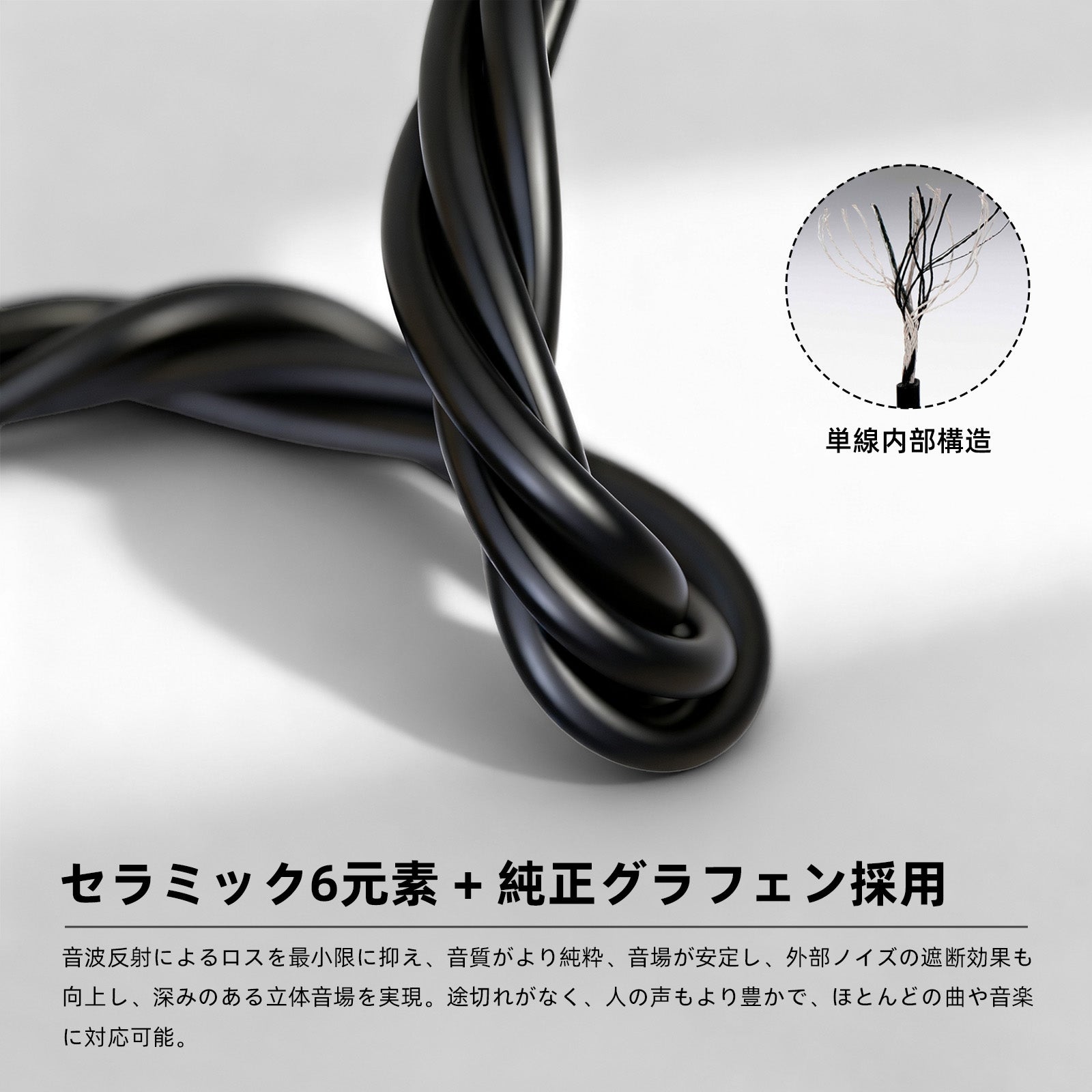 「純正グラフェン」線芯と「セラミック6元素」が、信号の反射や外部ノイズを低減。 デジタル領域でもジャッターやエラーを抑え、アナログ変換後の音質の純粋さと立体感のある音場を支えます。